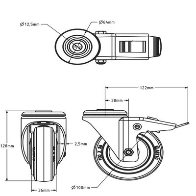 Roda giratória em borracha azul com travão 100 mm - 160 kg